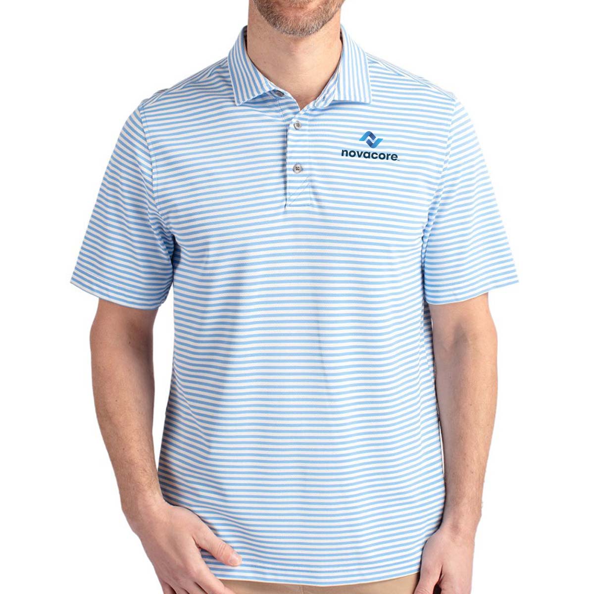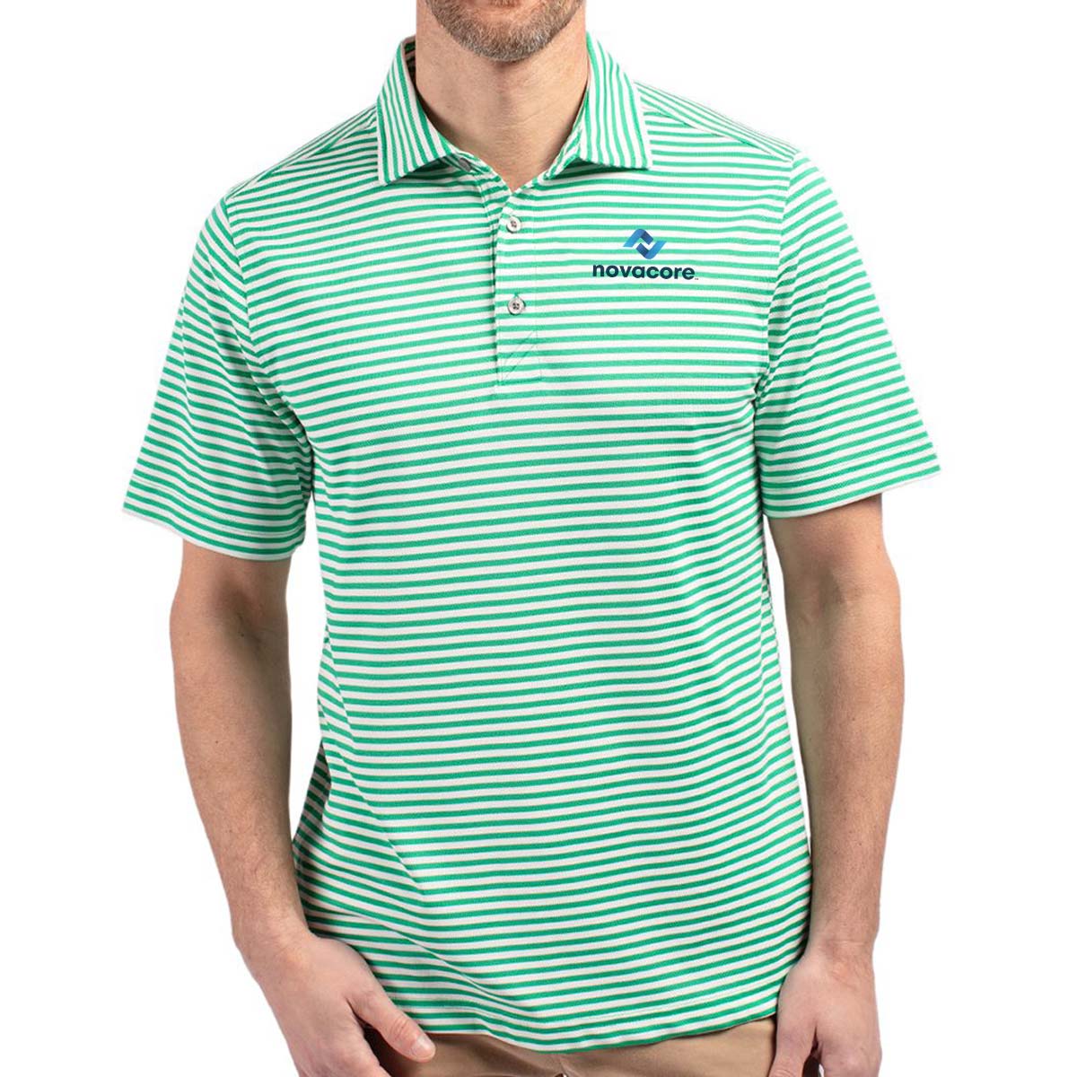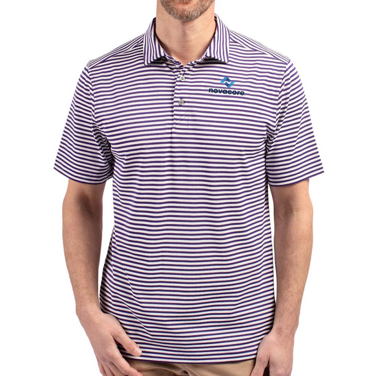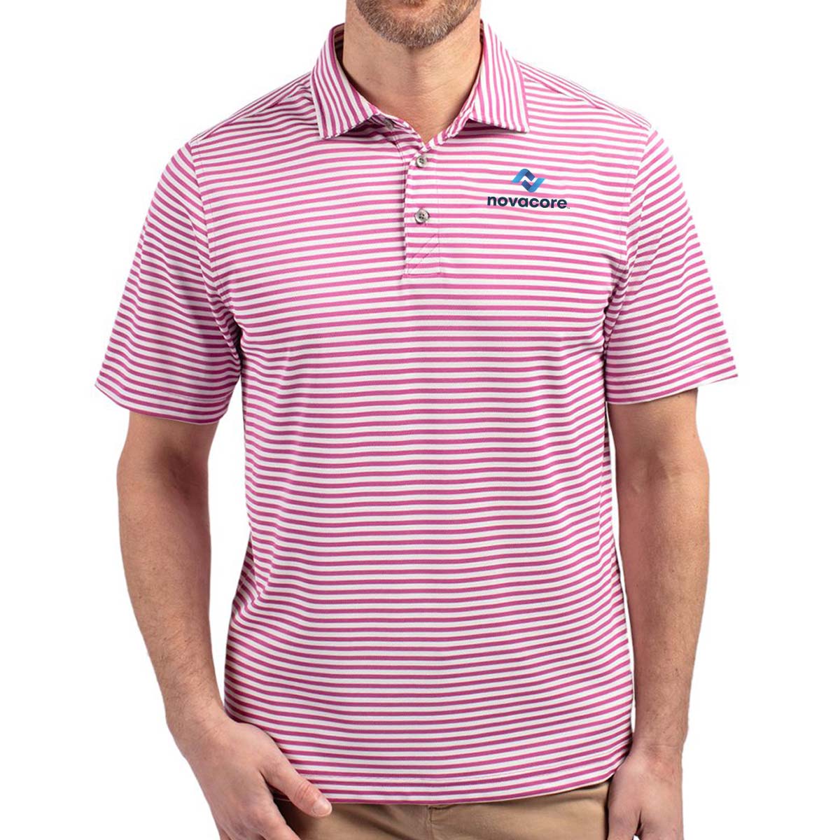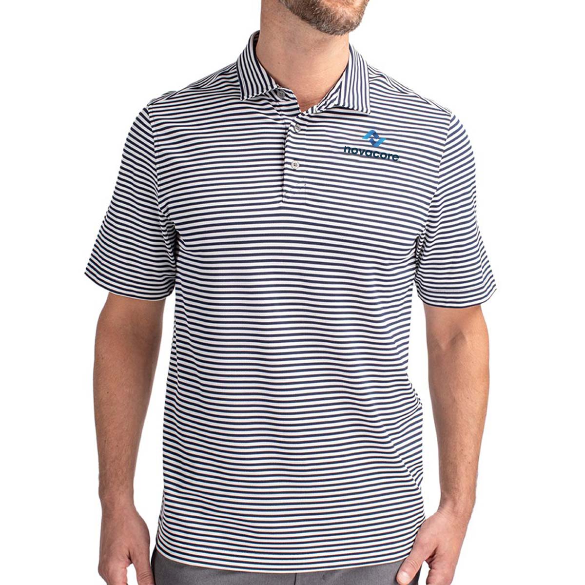 High quality certified eco-friendly recycled polyester is blended with drytec polyester and spandex for stretch, a cooling effect, and UPF sun protection, resulting in a versatile, sustainable, and comfortable striped polo for you and the planet.