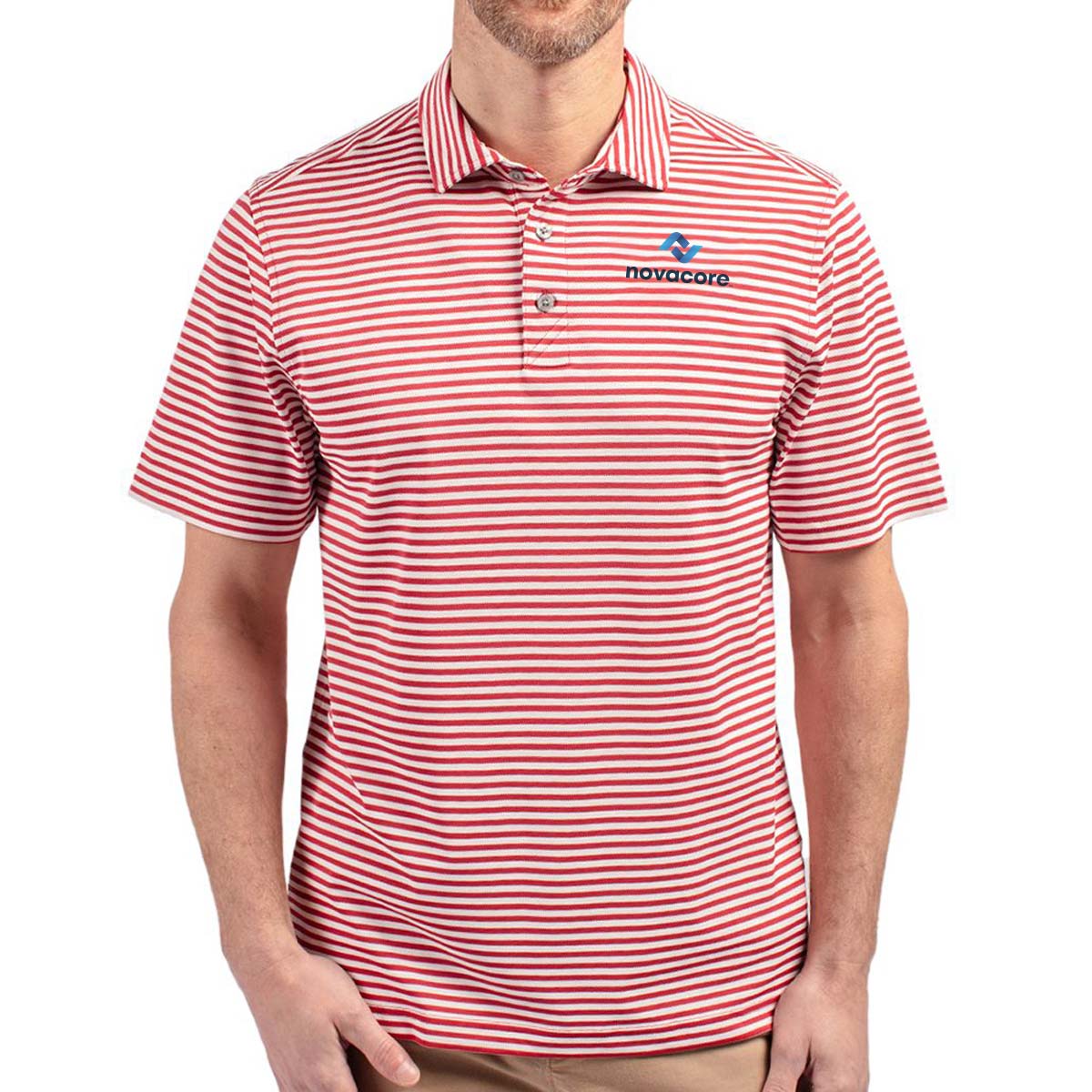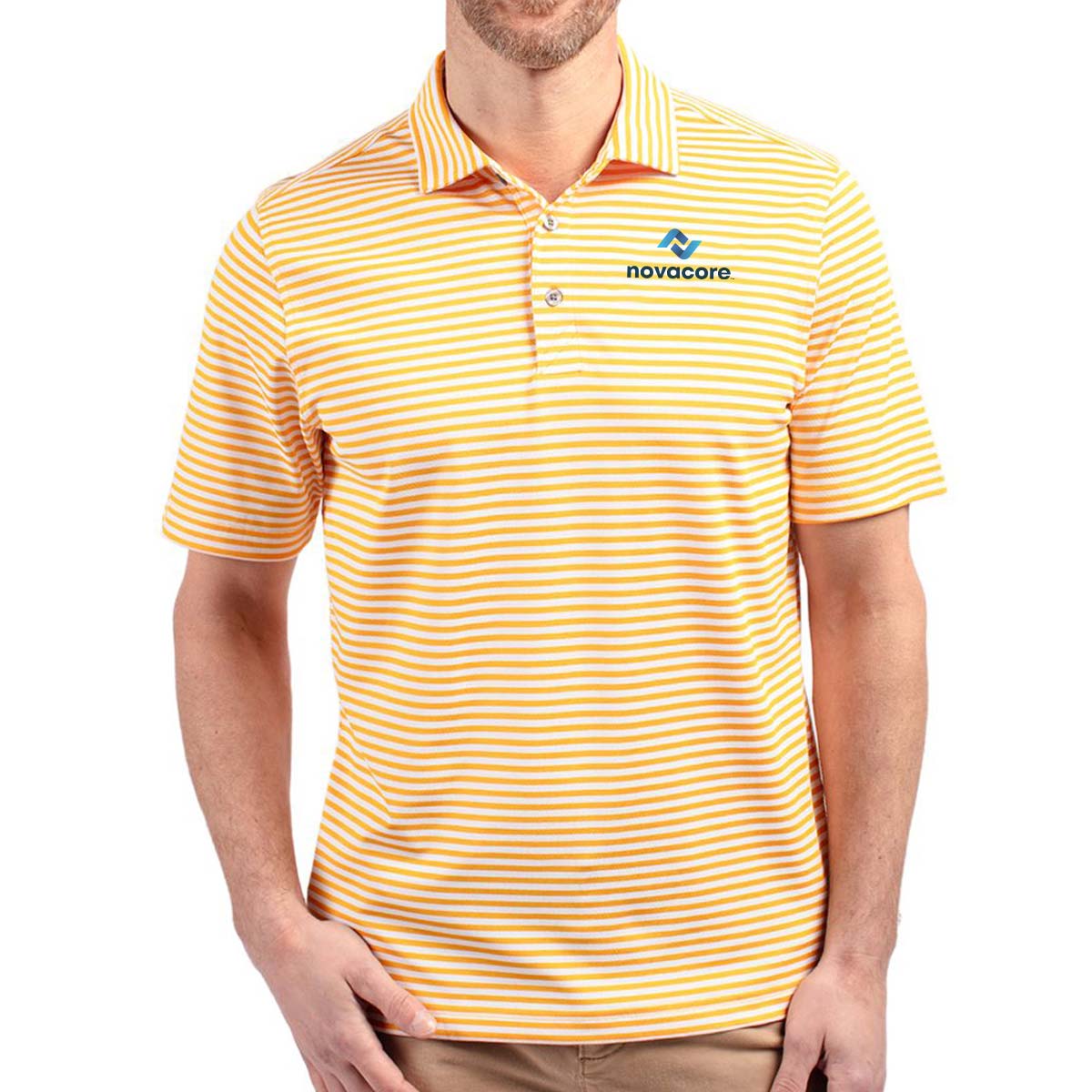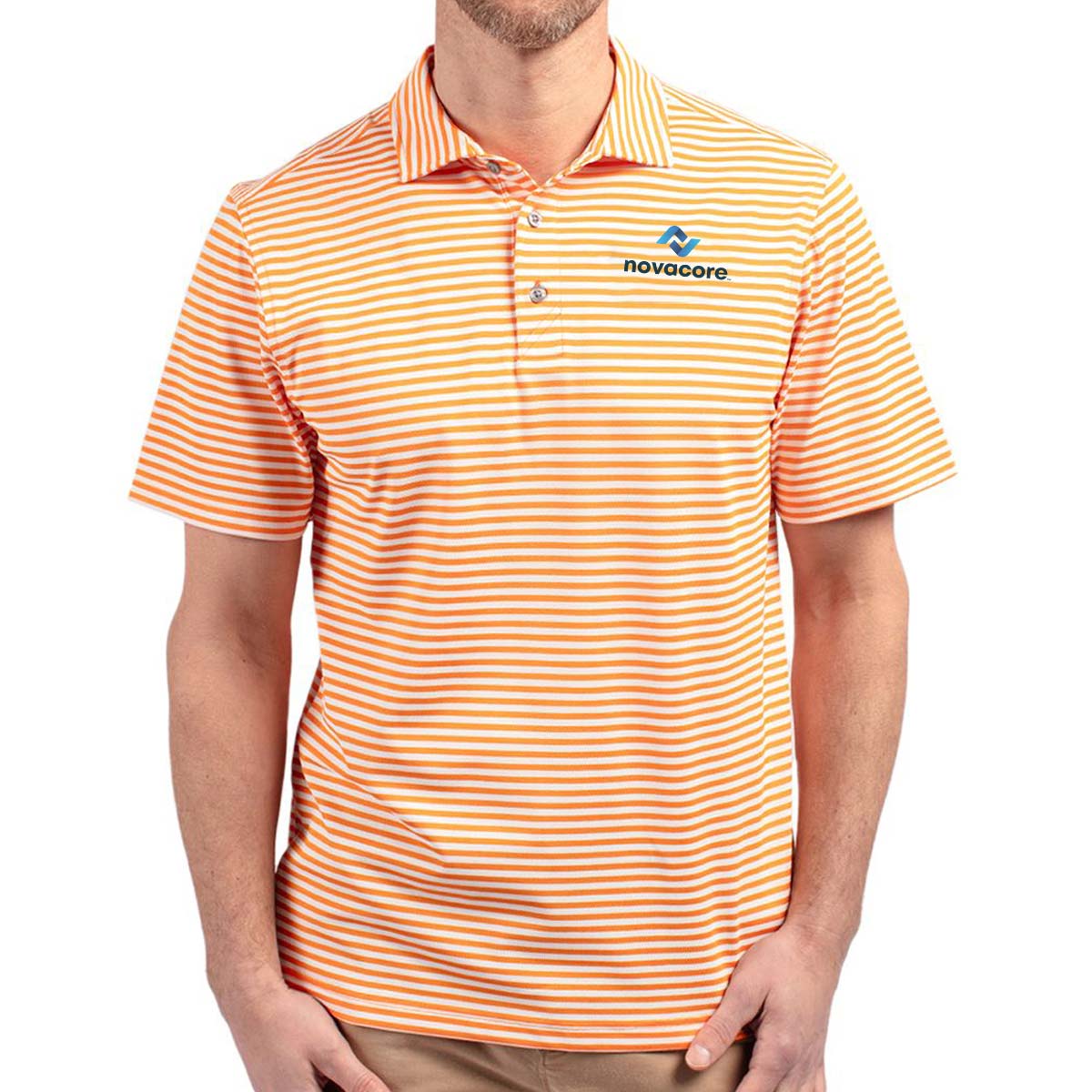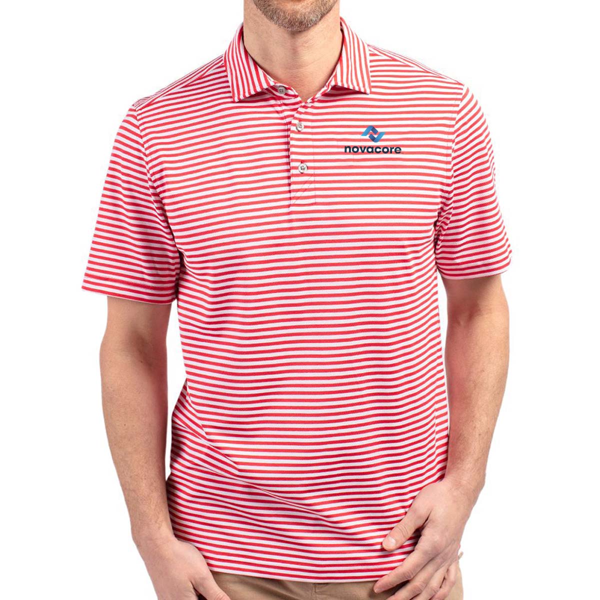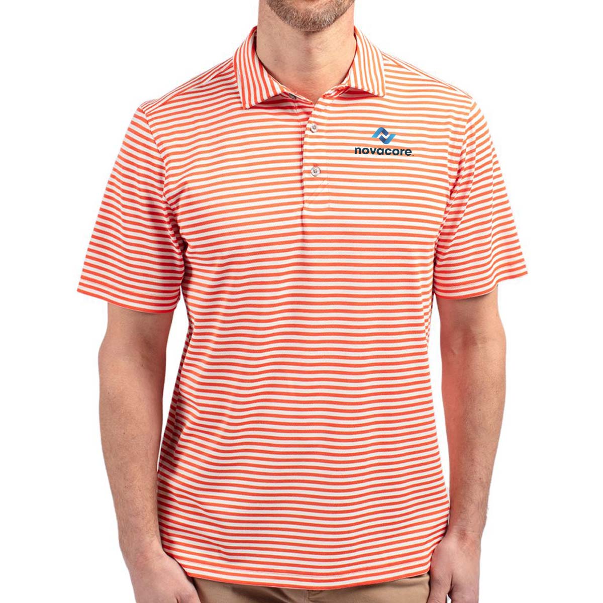 High quality certified eco-friendly recycled polyester is blended with drytec polyester and spandex for stretch, a cooling effect, and UPF sun protection, resulting in a versatile, sustainable, and comfortable striped polo for you and the planet.